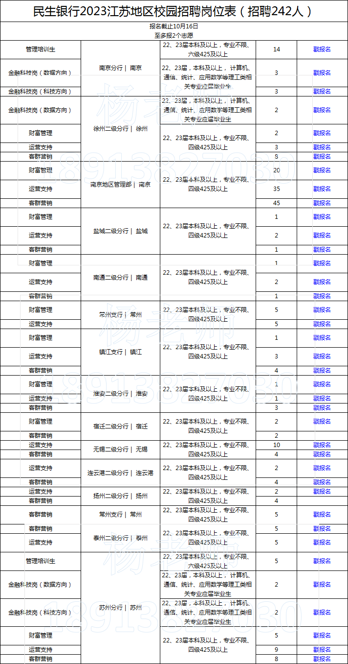 民生銀行2023江蘇地區(qū)校園招聘崗位表
