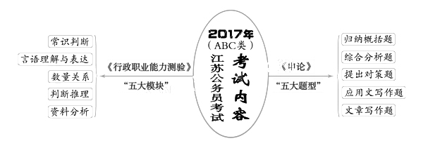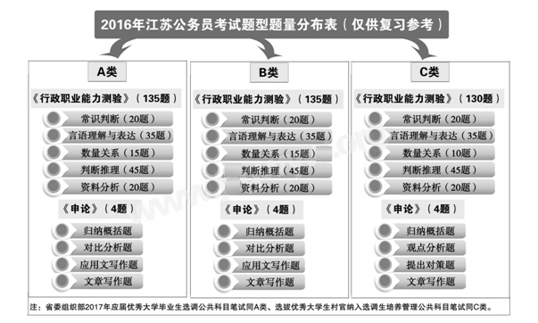 【考查科目】2017年江蘇公務(wù)員考試中,A、B、C三類筆試科目均為《行政職業(yè)能力測驗》和《申論》兩大科目。根據(jù)崗位分類進行劃分,不同類別的試卷將在題型題量設(shè)置和試題難易程度上予以區(qū)分。
