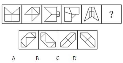 (答案:B。所有圖形均為軸對(duì)稱圖形,從對(duì)稱軸的變化來看,有兩個(gè)規(guī)律:一是對(duì)稱軸位置,第一個(gè)圖形對(duì)稱軸是垂直狀態(tài),之后圖形的對(duì)稱軸依次順時(shí)針旋轉(zhuǎn)45度,按此規(guī)律,問號(hào)處圖形的對(duì)稱軸位置應(yīng)在從左下到右上的位置;二是對(duì)稱軸是否和圖形內(nèi)的一條線重合,第一個(gè)圖形對(duì)稱軸與圖形內(nèi)的一條線重合,第二則不重合,第三個(gè)重合,按此規(guī)律,問號(hào)處圖形的對(duì)稱軸應(yīng)和圖形內(nèi)的線不重合。因此,正確答案為B。)