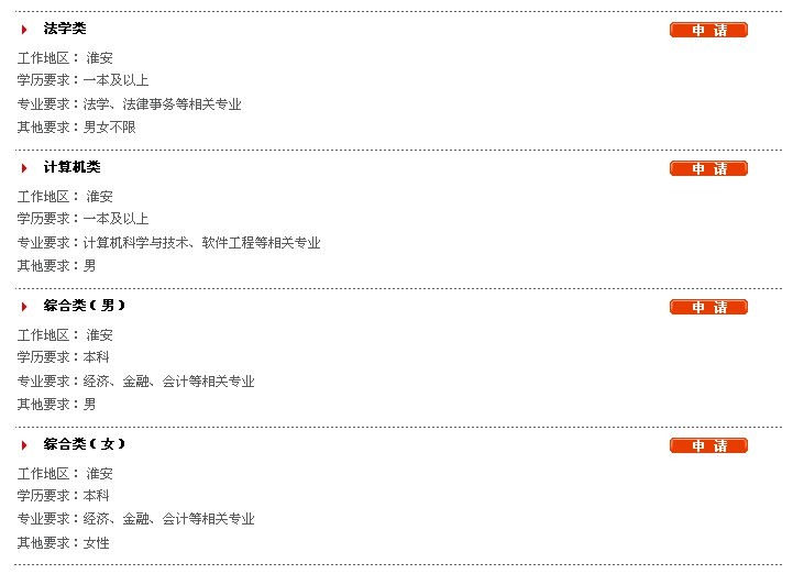 綜合類45名(經(jīng)濟、金融、財會等相關(guān)專業(yè),男25名、女20名);法學(xué)類2名(法學(xué)、法律事務(wù)等相關(guān)專業(yè),一本及以上,男、女不限);計算機科學(xué)類3名(計算機科學(xué)與技術(shù)、軟件工程等相關(guān)專業(yè),一本及以上,男)。