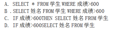 若學生表中存儲了學號、姓名、成績等信息,則“查詢學生表中所有成績大于600分的姓名”的SQL語句是(   )。