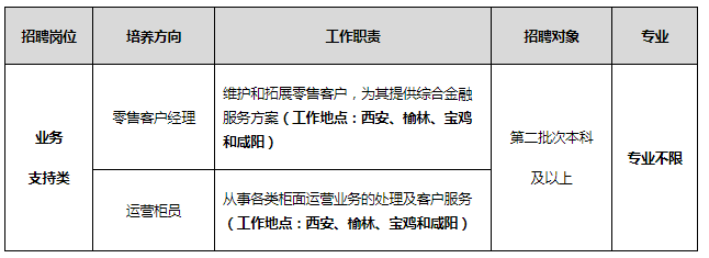 通過系統(tǒng)性培訓(xùn)和崗位培養(yǎng),在西安及榆林、寶雞和咸陽區(qū)域,從事客戶營銷、市場拓展、運(yùn)營支持等崗位工作,成長為精通銀行業(yè)務(wù)的專家型人才。