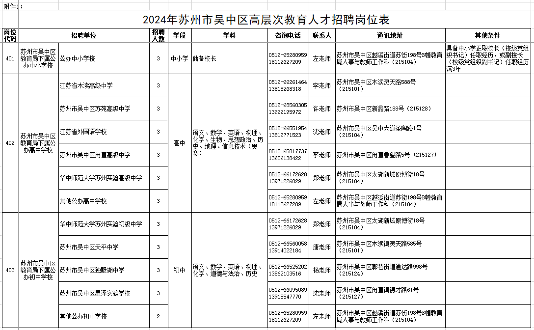 (三)郵寄地點(diǎn)及聯(lián)系人:見(jiàn)《2024年蘇州市吳中區(qū)高層次教育人才招聘崗位表》(附件1)。