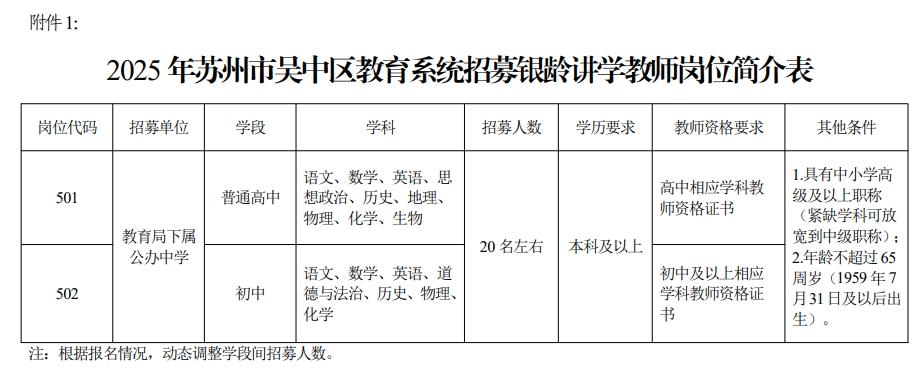 招募崗位及人數(shù)詳見《2025年蘇州市吳中區(qū)教育系統(tǒng)招募銀齡講學(xué)教師崗位簡介表》(附件1)。