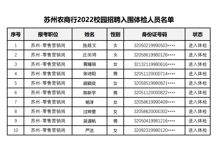 ?  感謝各位應聘者對蘇州農(nóng)商銀行2022年春季校園招聘的關(guān)注!根據(jù)筆試、面試環(huán)節(jié)綜合考評結(jié)果,最終確定進入體檢環(huán)節(jié)人員名單(詳見附件)。