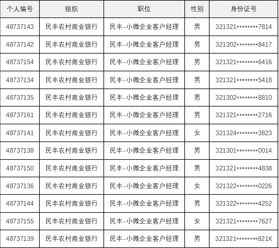 江蘇民豐農(nóng)村商業(yè)銀行2023年度小微企業(yè)客戶經(jīng)理招聘筆試已于2023年2月19日進行,現(xiàn)將通過筆試進入面試人員名單公布如下: