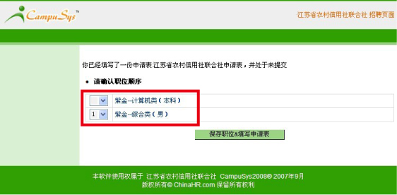 可以在中華英才網(wǎng)的“江蘇農(nóng)村商業(yè)銀行2014年招聘報(bào)名”頁(yè)面從新申請(qǐng)新的職位,然后把從新選擇的職位改成“1”,再點(diǎn)擊“保存職位&填寫(xiě)申請(qǐng)表”即可。